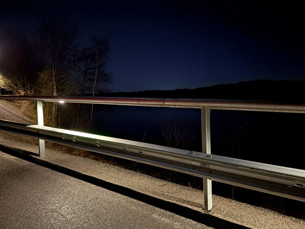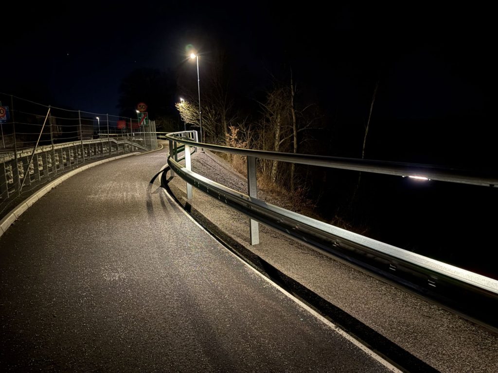 Lösningen har vi tagit fram i nära samarbete med vår räckesleverantör. Målet var att skapa en konstruktion som möter höga krav på trafiksäkerhet, hållbarhet och funktion, samtidigt som den fungerar i en miljö där cykelvägen löper parallellt med en obelyst motorväg. Resultatet är ett integrerat system där räcke och belysning samverkar i en smart helhetslösning.